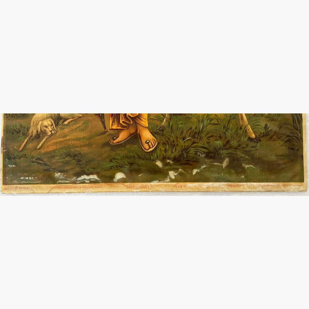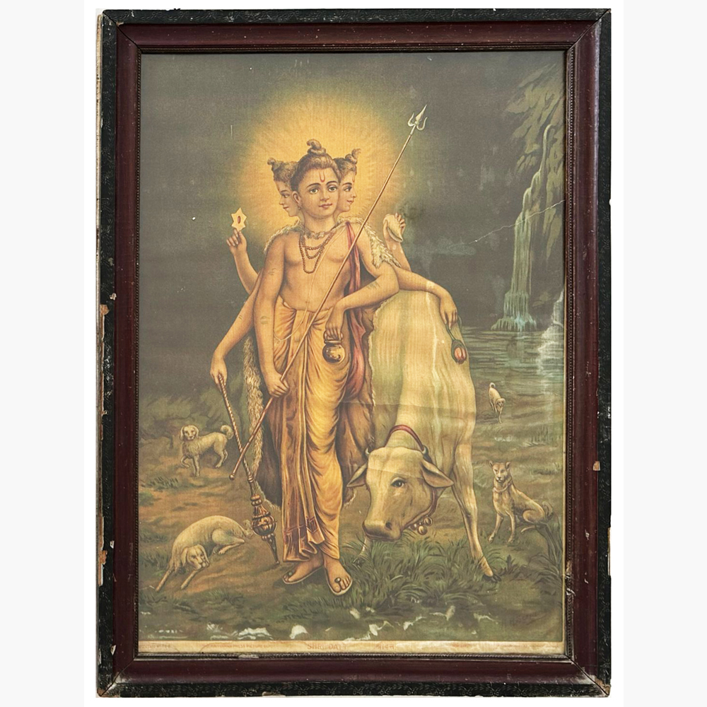 Dattatray 5 oleograph portraying Lord Dattatreya, the divine trinity of Brahma, Vishnu, and Shiva. Explore this devotional artwork on Beyond Square.