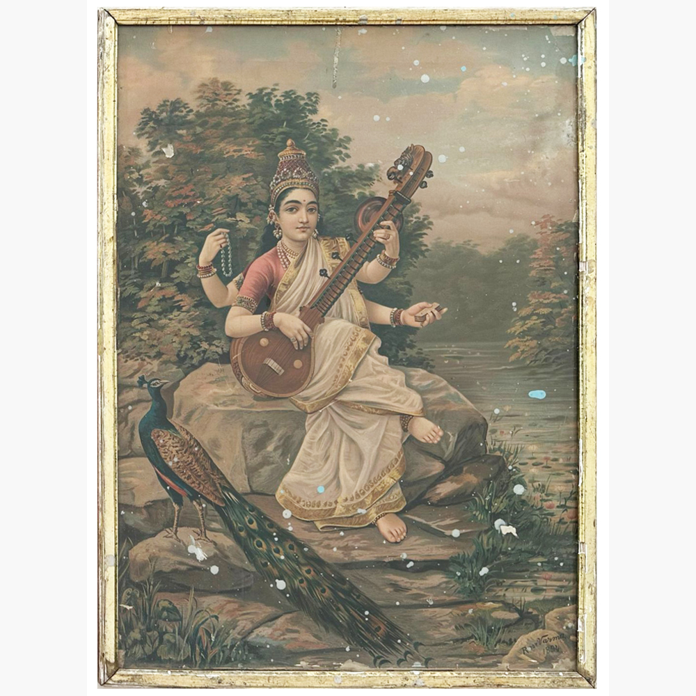 Graceful Saraswati 12 devotional artwork depicting the goddess of learning and music. Buy this elegant oleograph on Beyond Square.