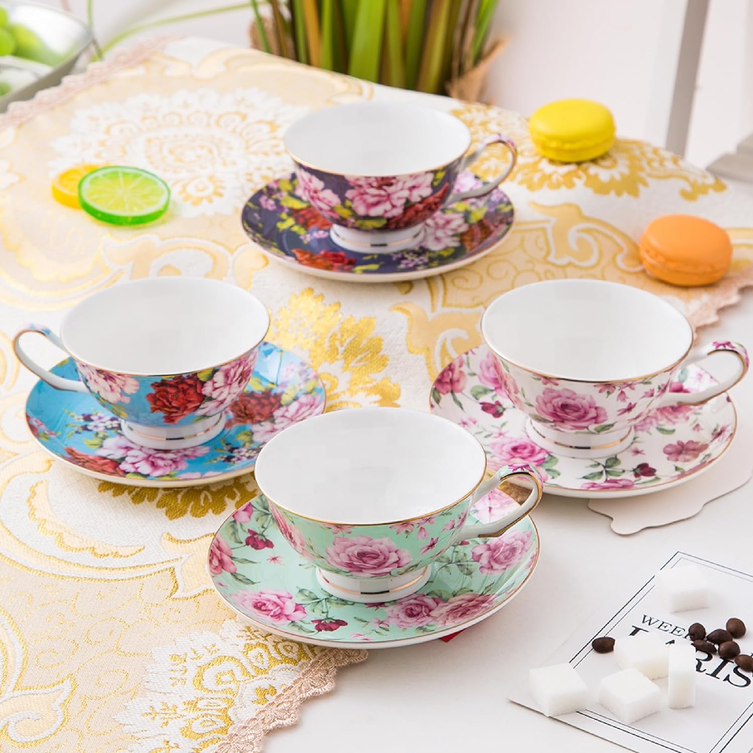 BTaT set of 4 tea cups and saucers, each with 7 oz capacity, features vibrant floral patterns that add a touch of elegance and charm to your tea time or special occasions.With a generous 7 oz capacity, these tea cups are perfect for enjoying your favorite tea, coffee, or other beverages, providing versatility for any occasion.Crafted from high-quality porcelain, these tea cups and saucers are both durable and lightweight, ensuring they can withstand daily use while maintaining their beautiful appearance.The set is beautifully packaged in a luxurious red gift box, making it an ideal gift for weddings, anniversaries, housewarmings, or any other special occasion.The smooth porcelain surface of these tea cups and saucers is easy to clean and dishwasher safe, providing convenience for everyday use and effortless maintenance.