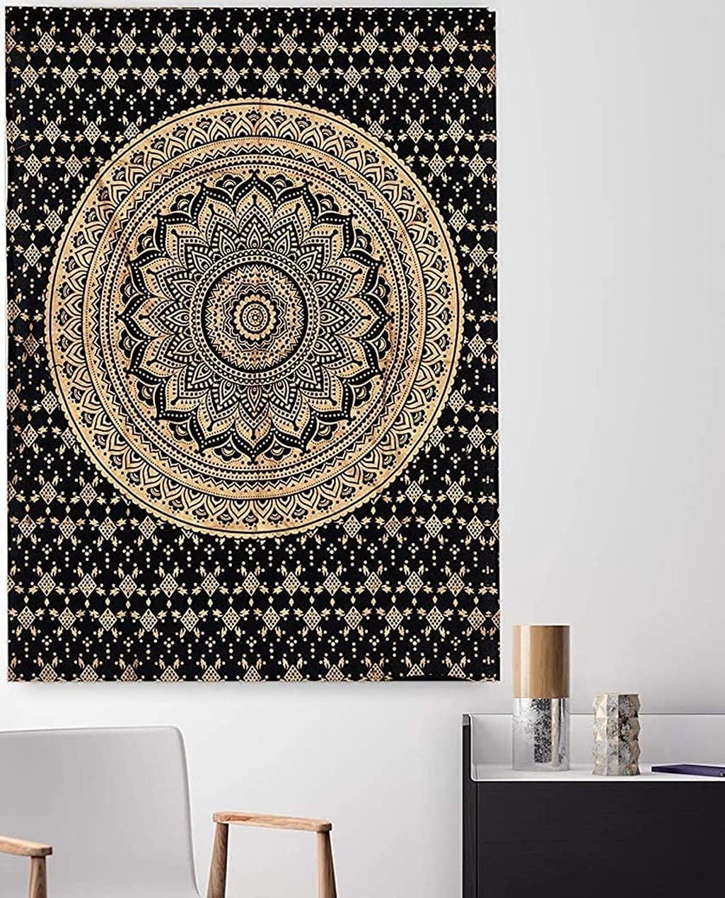 raajsee Glittering Silver Grey Tapestry Wall Hanging Mandala-Bohemian Room Decor-Indian Cotton Throw Hippie Tapestries -Boho Bedding White Golden Queen bedspread 82x92 inches-Meditation Yoga Mat Rugs