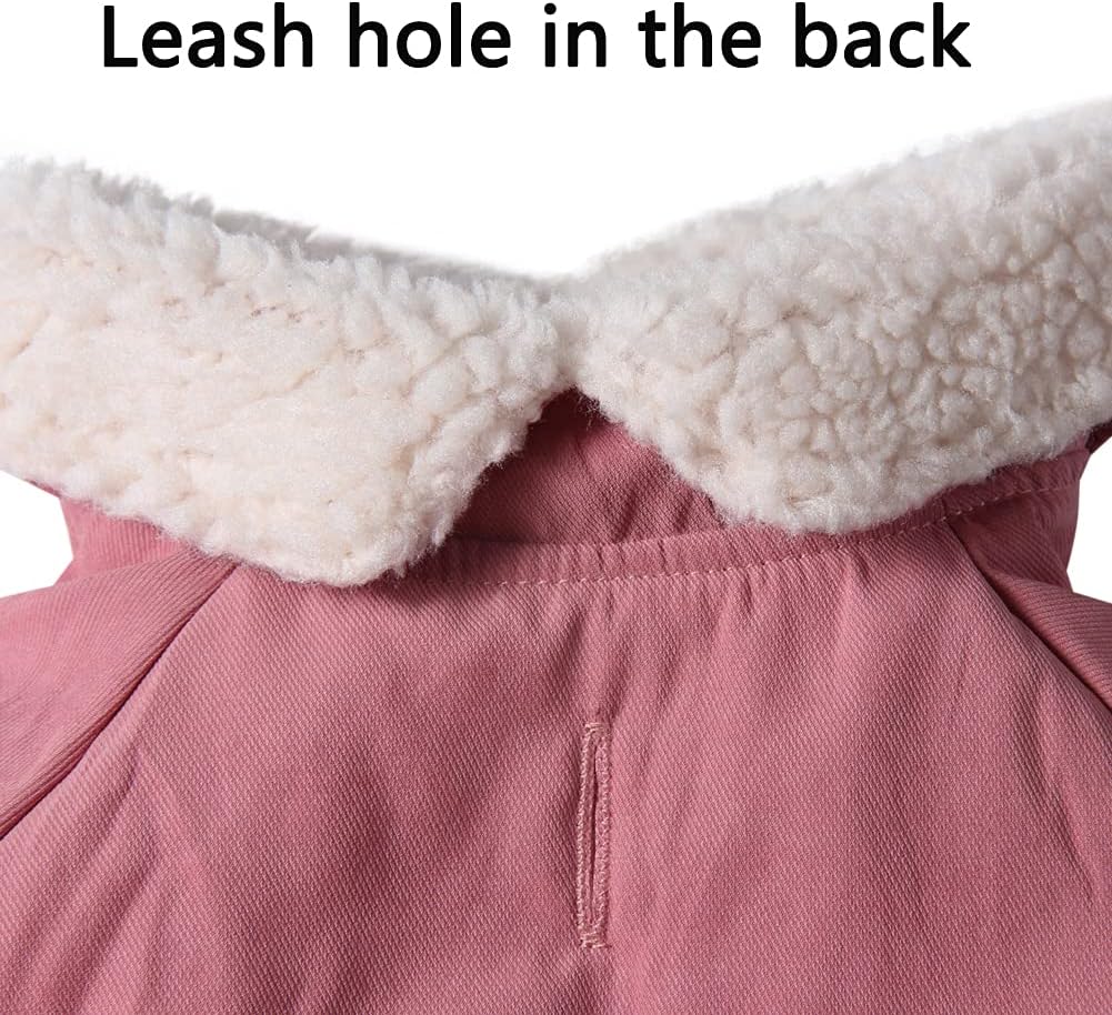 News dog coat with front legs,Best for small dogs. Material: Fashion fleece V-Collar desgin; front legs with fleece edges; Soft fleece lining,keep super warm in the the cold winter/snow; Features: Easy put on and take off by snaps; Leash hole in the back; Wide reflective strip,it is brighter at night; Durable,Exquisite sewing; Lightweight,Wind-proof,Soft,Warm Color:Pink; Note:you must measure your dog's size,reference size chart,Priority reference the chest girth. Size Chart: XS:Chest(9.5"-11.9"),Neck 10",Length 10"; S:Chest(12"-14.5"),Neck 12",Length 12"; M:Chest(14.6"-17"),Neck 13.5",Length 13.5"; L:Chest(17.1"-20.5"),Neck 15",Length 15"; XL:Chest(20.6"-23.5"),Neck 17",Length 17"; XXL:Chest(23.6"-27"),Neck 19.5",Length 19"; XXXL:Chest(27.1"-30.9"),Neck 22.5",Length 23"; TIPS:if the size is between in 2 sizes,we suggest you select larger size;