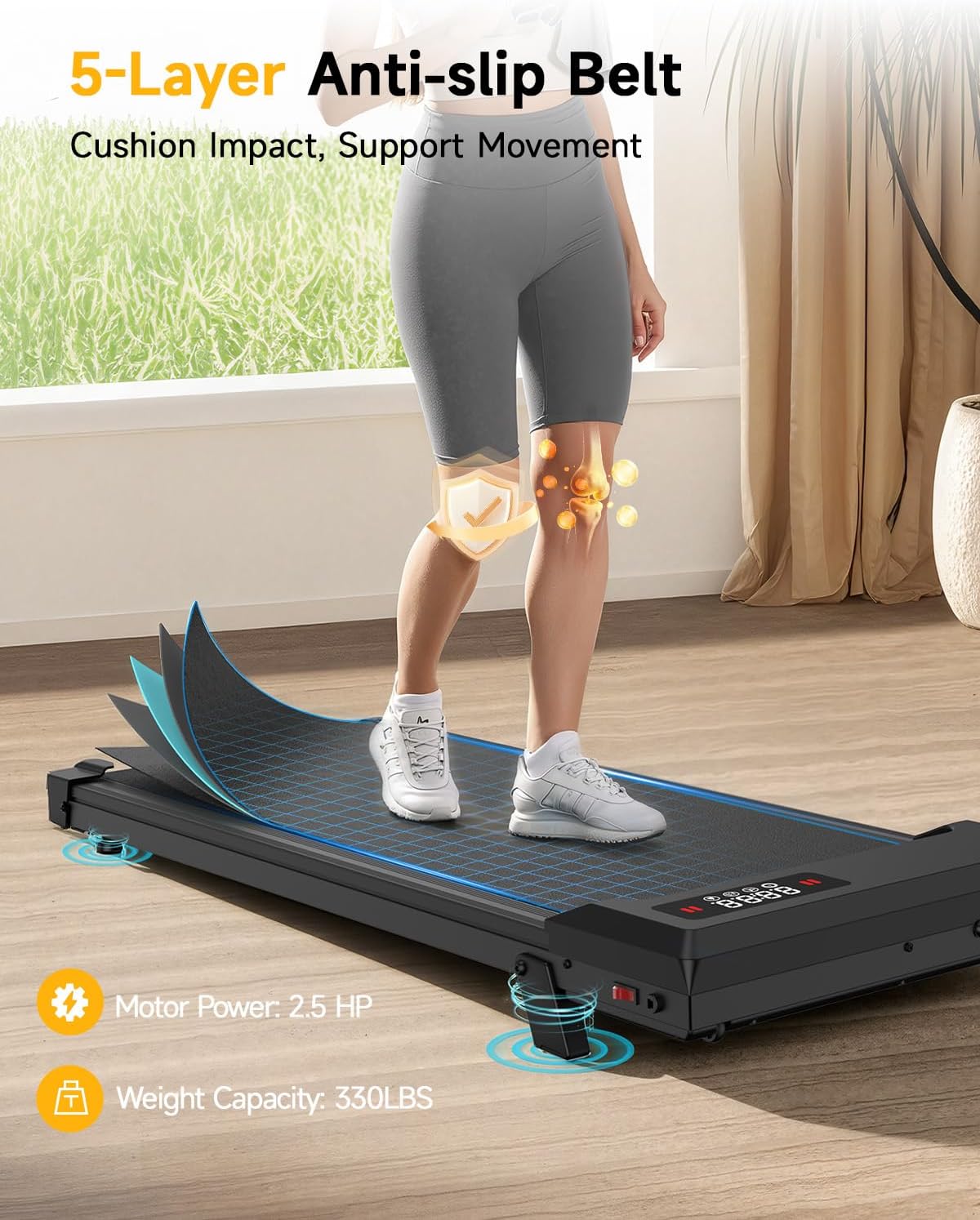 | Additional Features | Adjustable Speed(0.6-5MPH) Portable Treadmill with Incline, High-Performance Silent 2.5HP Motor Treadmill for Small Spaces, Under Desk Walking Treadmill Clear View LED + On-The-Fly Remote, Up to 330 Lbs Capacity Quiet Walking Pad, Walking Pad Treadmill 8% Golden Incline for Max Efficiency |