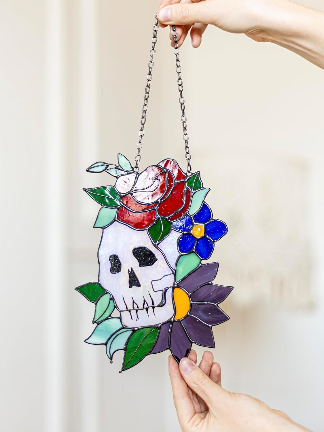 Add a touch of spooky charm to your decor with this Floral Skull Stained Glass Suncatcher. Perfect for Halloween or everyday use, this handcrafted piece features a skull beautifully intertwined with vibrant flowers, making it a striking focal point in any room. Hang it in your window or on a wall to catch the light and create a captivating ambiance.
