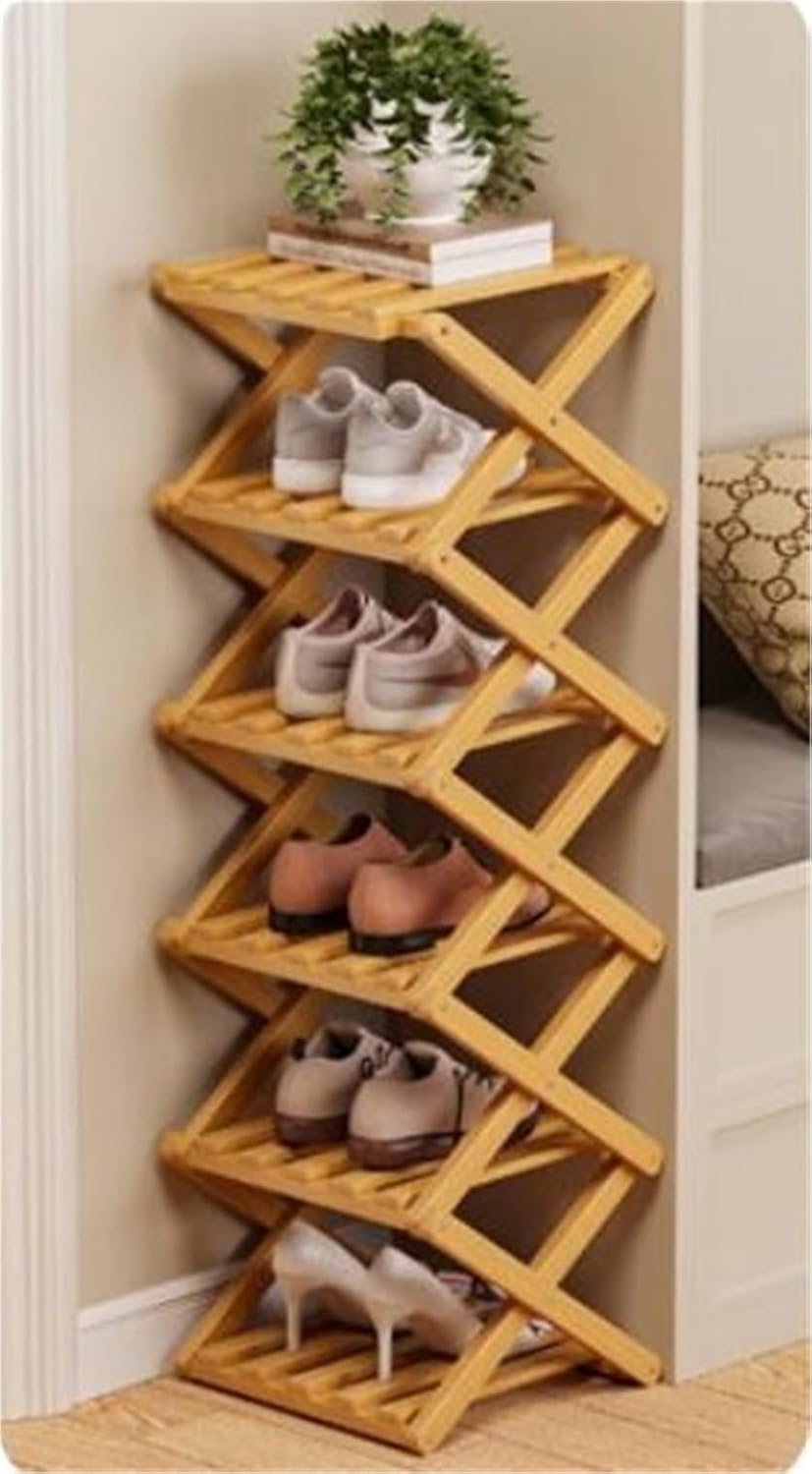 This foldable bamboo shoe rack is a smart and space-saving shoe storage solution for modern homes, designed to keep shoes neatly organised while also working as a plant stand, bookshelf or display shelf. Made from strong natural bamboo, this freestanding shoe organiser is sturdy, warp-resistant and durable enough to hold boots, trainers and everyday footwear without bending. The slim vertical design fits perfectly in small spaces such as entryways, hallways, bedrooms, closets or corners, making it ideal for flats, dorm rooms and compact homes. No assembly is required — simply unfold and use, and fold it away easily when not needed. With its smooth hand-polished finish and clean natural look, this bamboo shoe rack combines practical storage with stylish home organisation.Products Details:Name: Shoe rackMaterial: BambooNumber of Layers: 2 tiers, 3 tiers, 4 tiers, 5 tiers, 6 tiers, 7 tiers, 8 tiers, 9 tiers, 10 tiersSize: 26*26cmColor: Original colorFoldable: YesSpecific Use: HouseholdPackage includes:1 x Shoe rackTips:1: Due to the difference in display and lighting effects, the actual color of the product may be slightly different from the color shown on the picture.2: Due to manual measurement, please allow an error of 1-3cm.Hope you have a good shopping!